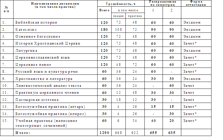 Учебный план подготовительного отделения включает дисциплины, которые не вошли в программу бакалавриата, но необходимы для сохранения фундаментальности духовного образования в стенах семинарии. Библейская история, Катехизис, Основное богословие, Русский язык и культура речи, Христианство и литература, Практикум церковного чтения, Пастырская эстетика – далеко не полный перечень дисциплин, которые предстоит изучать на первом курсе семинарии будущим пастырям. Пропедевтический курс рассчитан на 1290 часов и помимо аудиторных и самостоятельных занятий предполагает практику: богослужебную (в алтаре и на клиросе) и учебную. При прохождении учебной практики студенты семинарии будут применять теоретические знания для написания сочинений, что важно для будущего служения, ибо служение священника – это служение слова.