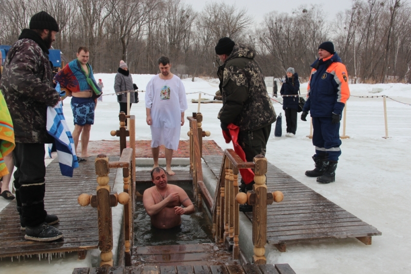 Тысячи хабаровчан, несмотря на холод и пронизывающий ветер, погружались в холодную воду иорданей, которые соорудила по случаю праздника МЧС. Эта традиция приобщения к той благодати, которую послал на «естество» всех вод Господь.