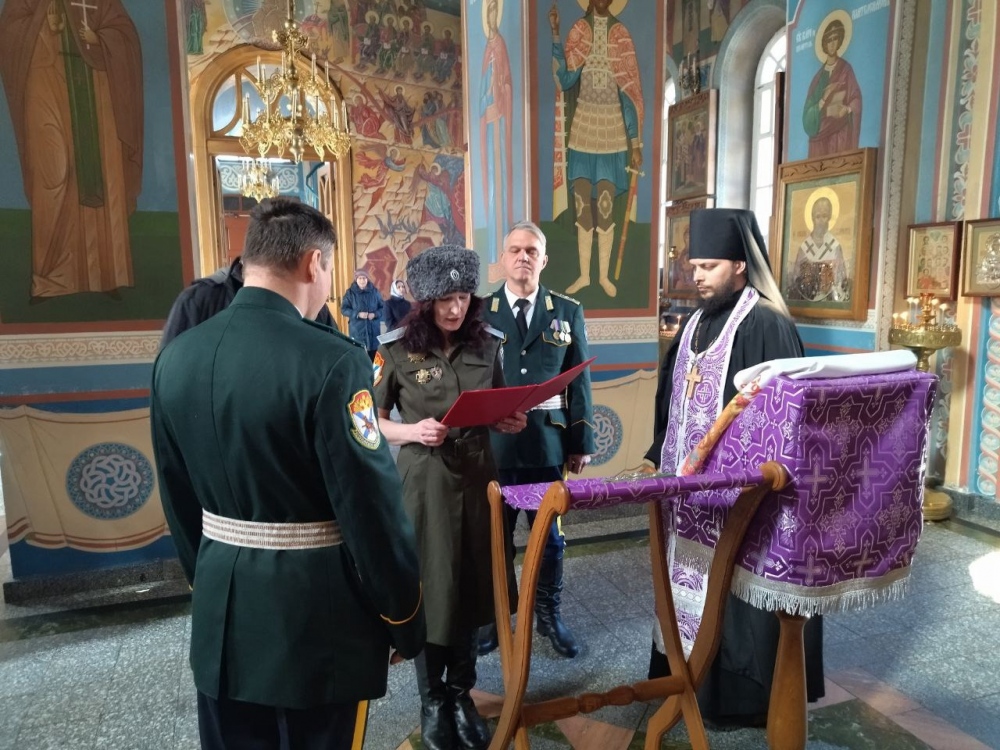 Присягу Ярославы Чулковой принял атаман станицы старший вахмистр Андрей Анатольевич Гудошников и настоятель храма святителя Иннокентия Иркутского иеромонах Софроний (Медведенко).