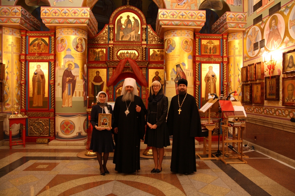 По окончании встречи владыка Артемий провел для гостей экскурсию по домовому храму Хабаровской семинарии и преподнес в дар Татьяне Борисовне икону Божией Матери.