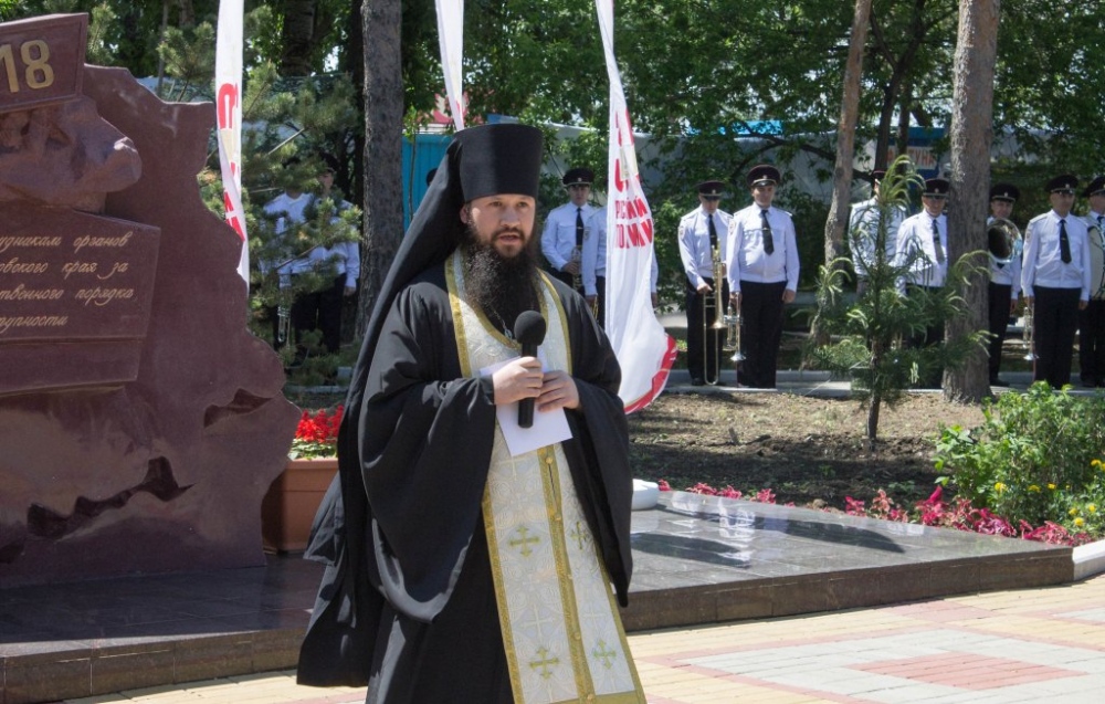 Перед освящением памятника секретарь Хабаровской епархии иеромонах Николай (Белозеров) обратился к присутствующим.