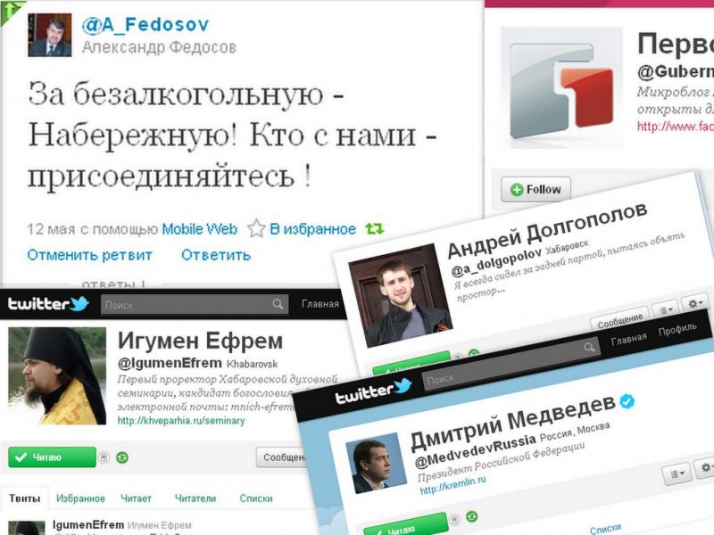 Не отстают от «информационной моды» и хабаровские чиновники. Свой аккаунт в «Твиттере» имеют Начальник Управления образования администрации г. Хабаровска, Начальник отдела по делам молодежи администрации города, Министр здравоохранения, Министр молодежной политики, спорта и туризма, Министр образования и науки Хабаровского края, ну и сам Губернатор, конечно же.
