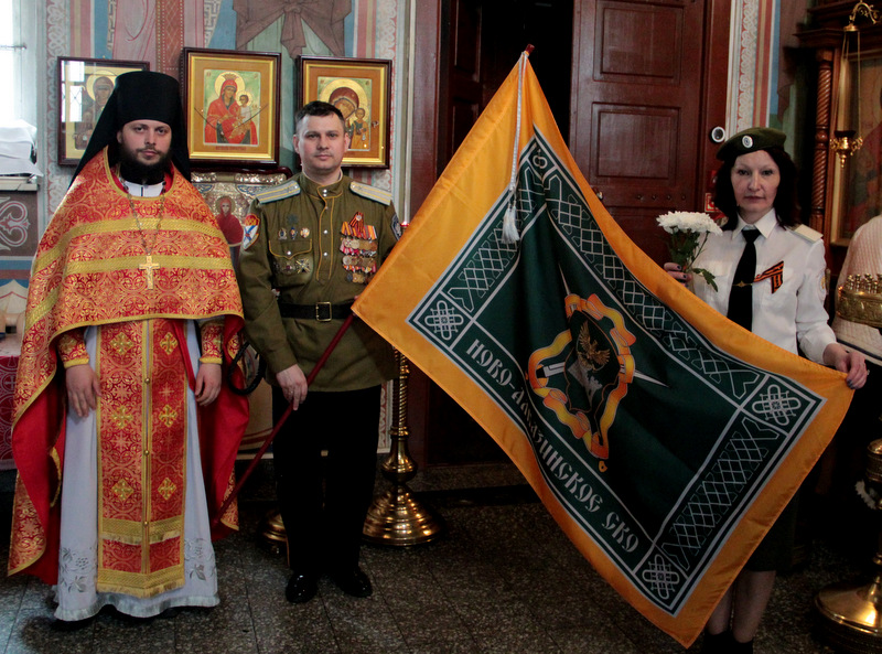 Завершив чин освящения, отец Софроний поздравил казаков общества и вручил знамя казачьему полковнику станичного общества Дмитрию Радькову.